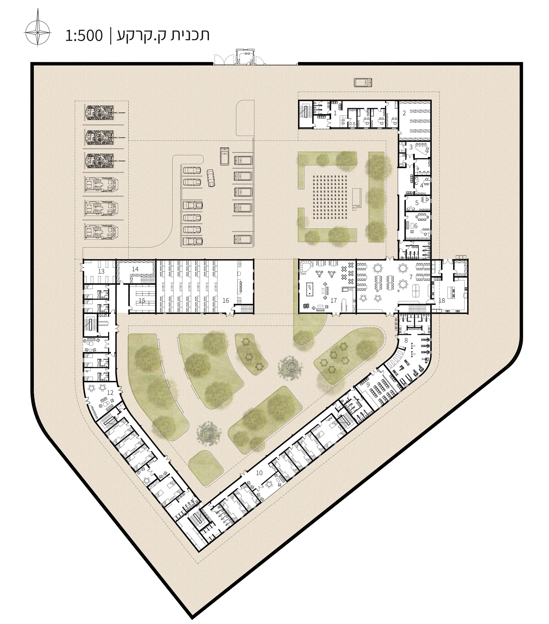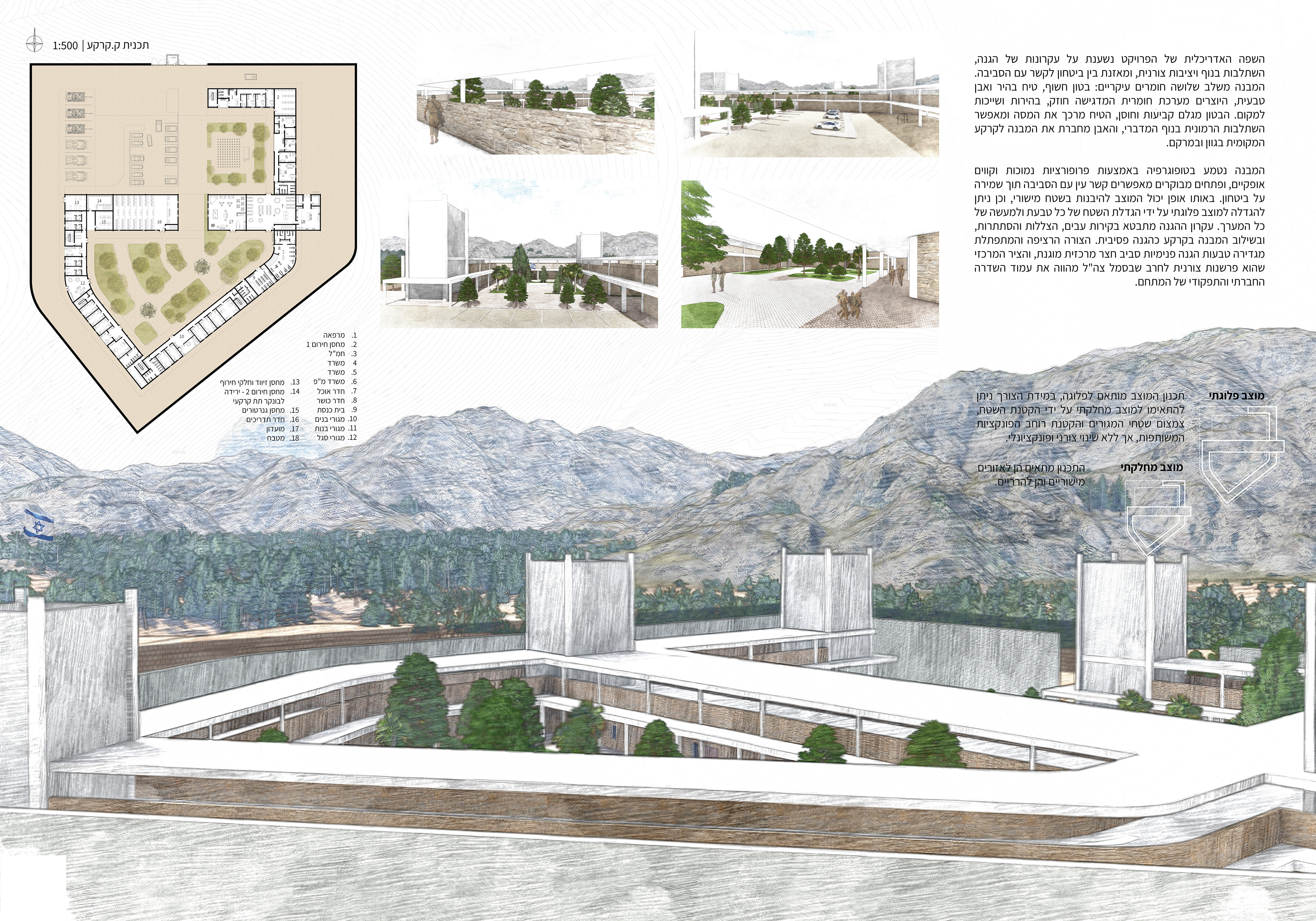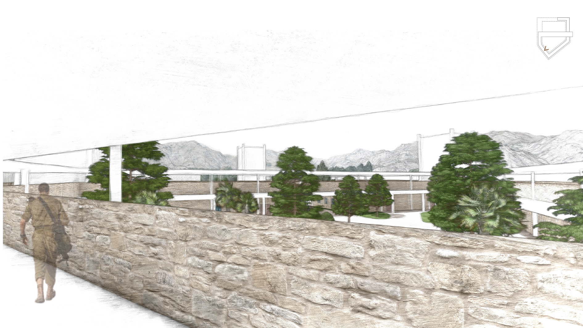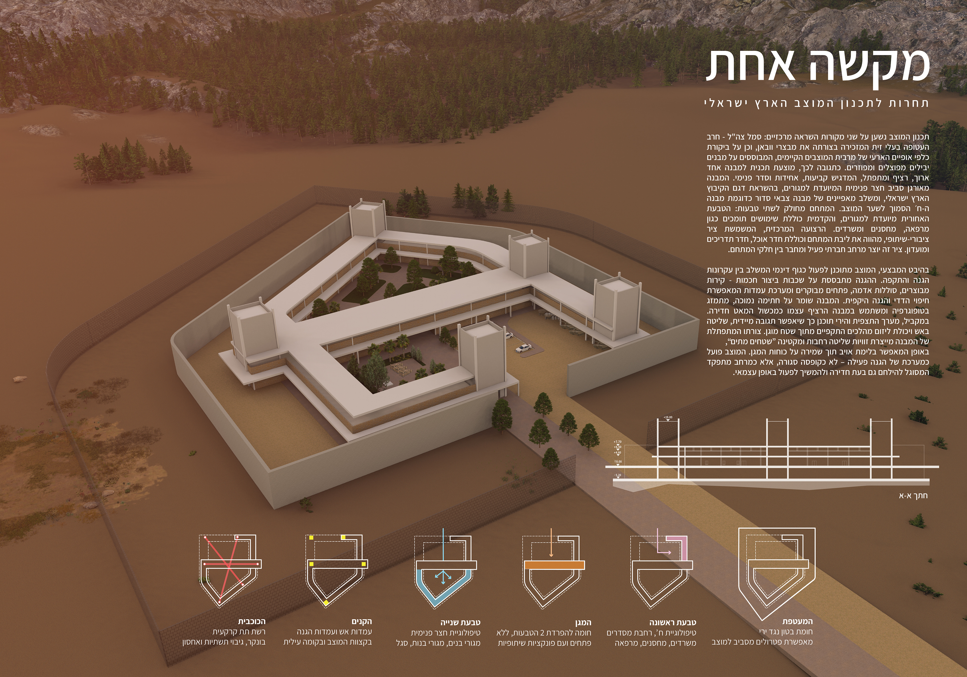 המוצב תוכנן כמבנה אחד ארוך ומתפתל, בהשראת סמל צה"ל ומבצרי וובאן, כתגובה למבנים יבילים ומפוזרים. התכנון מדגיש קביעות, אחידות וסדר פנימי סביב חצר מרכזית המיועדת למגורים, בדגם המזכיר קיבוץ. המבנה מחולק לשתי טבעות – אחורית למגורים וקדמית לשימושים תומכים, כשבמרכז ציר ציבורי הכולל חדר אוכל, מועדון ותדריכים. הצורה הרציפה תורמת לביצור, לחיפוי הדדי ולתפקוד מבצעי דינמי המשלב הגנה והתקפה. השפה החומרית משלבת בטון חשוף, טיח בהיר ואבן טבעית, להבעה של חוזק, בהירות ושייכות לנוף